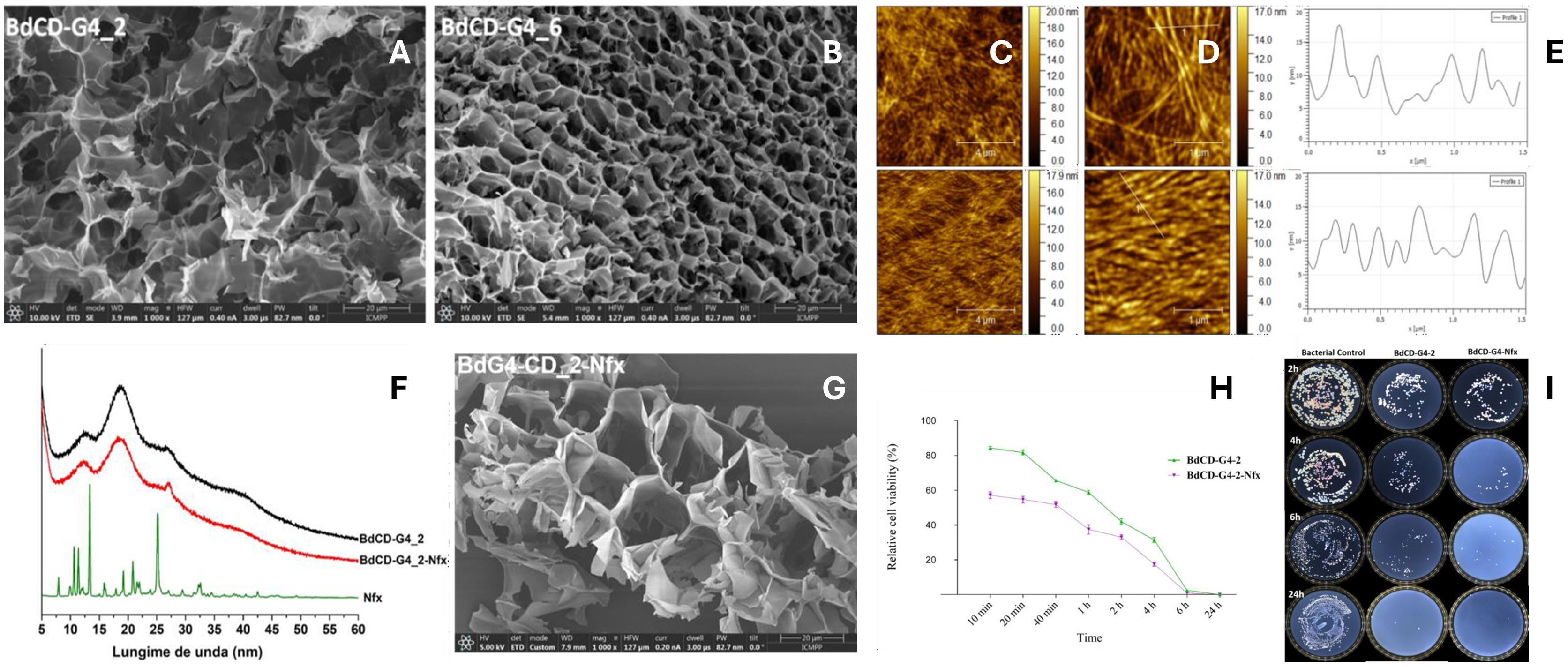 Fig. 1. Representative SEM images of xerogels (A) BdCD-G4_2 and (B) BdCD-G4_6 at a scale of 20 µm. AFM images of hydrogels: (C) scale bar – 4 µm; (D) scale bar – 1 µm; (E) Z-profiles along the marked lines. (F) PXRD patterns of lyophilized norfloxacin (Nfx), xerogel BdCD-G4_2, and BdCD-G4_2-Nfx formulation. (G) SEM image of formulation BdCD-G4_2-Nfx at 20 µm. (H) Inhibition of bacterial colony growth expressed as viable cell percentage vs. incubation time; (I) S. aureus colonies after 2–24 h incubation with the synthesized hydrogels.