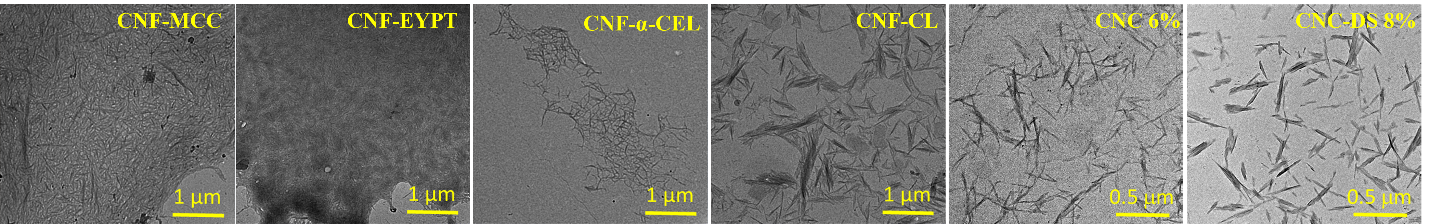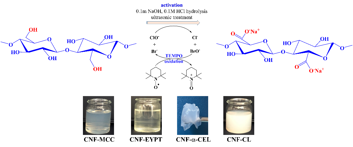 - Oxidized cellulose nanofibers were successfully obtained using the TEMPO/NaClO/NaBr protocol, starting from various cellulose sources (CL, MCC, α-CEL, TEG1-2, EYPT) after physico-chemical activation, resulting in CNF with different carboxyl group contents and high colloidal stability.