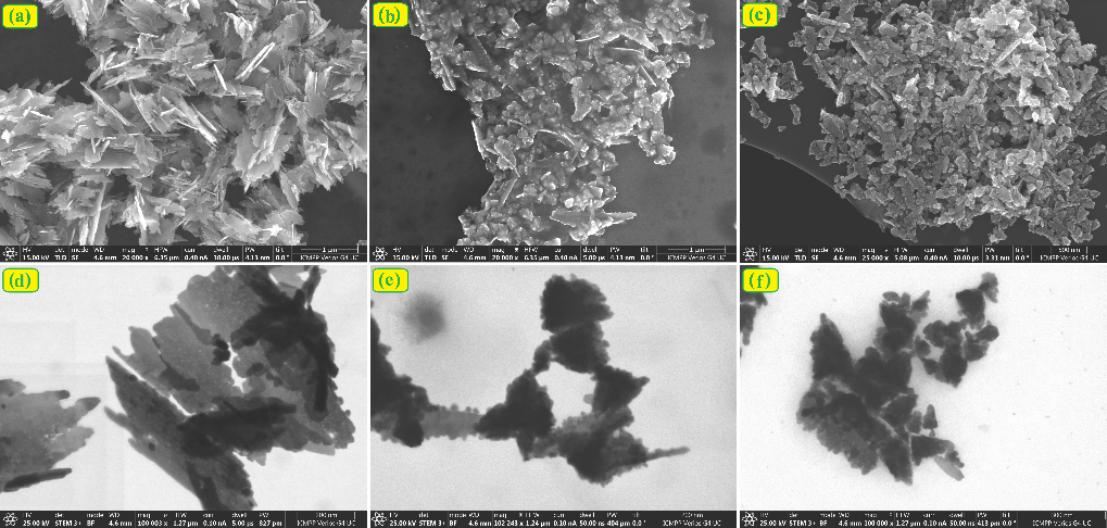 Figure 3. SEM (a, b, c) and STEM (d, e, f) micrographs of ZnO powders (ZnO-1 – a, d; ZnO-2 – b, e; ZnO-3 – c, f) synthesized during the stage.