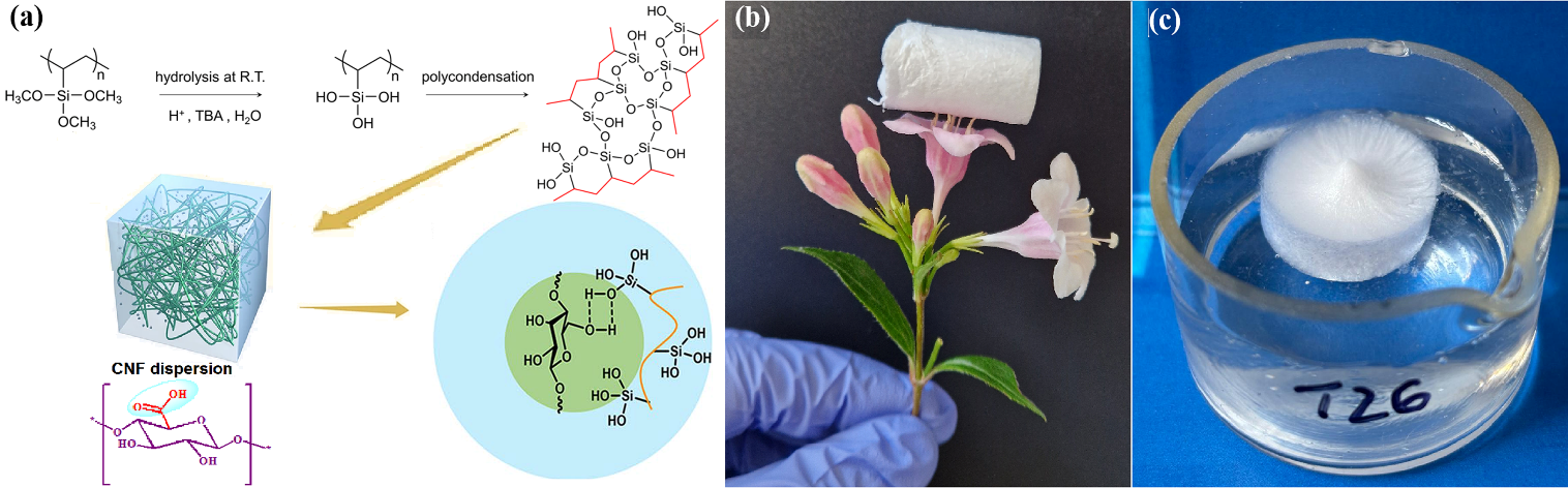 Hydrophilic CNF–PVTMS aerogels were prepared by freeze-drying and thermal polycondensation, obtaining ultra-light, floatable structures with densities between 15.7–87.9 mg/cm3 and controllable porosity by varying the CNF:PVTMS ratio.