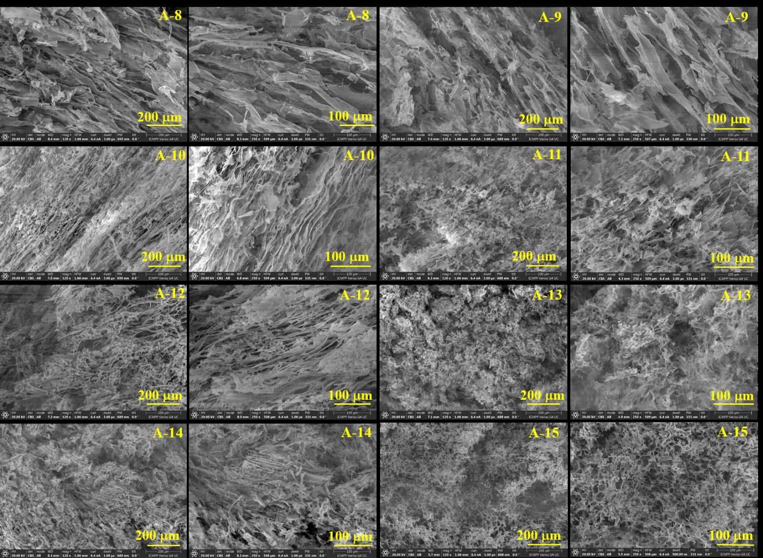 Figure 5. 15 SEM images at 120x and 250x magnification of aerogels A-8 – A-15.