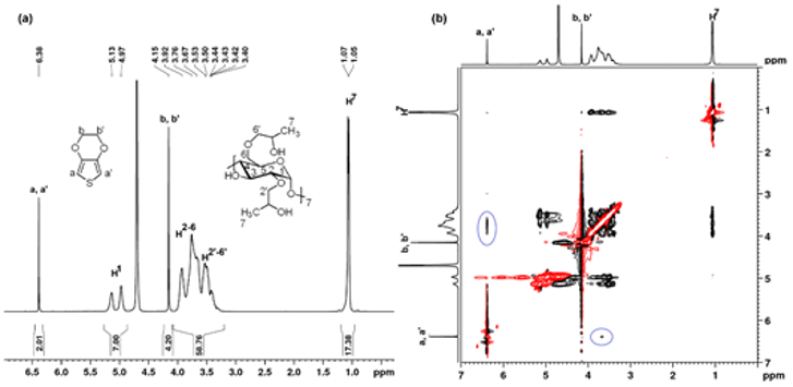 Fig. 2. The 1H-NMR (a) and HH-ROESY NMR (b) in D2O of the EDOT-HPβCD IC. |