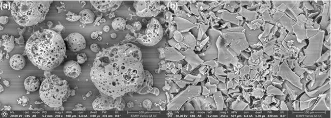 Fig. 3. SEM images of the HPβCD (a) and EDOT-HPβCD IC (b) |