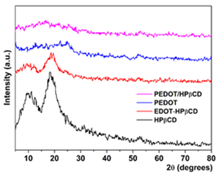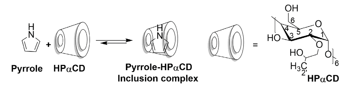 For this purpose, equimolar amounts of EDOT and cyclodextrins, or Pyrrole and HPαCD were mixed in water solutions. The ICs were obtained as white powders by lyophilisation. The chemical structures of the ICs were proved by 1H NMR, 2D NMR, FTIR, SEM microscopy, thermal analysis and molecular docking.