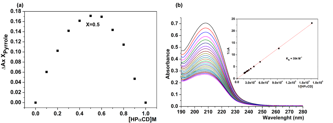 Fig. 5. The Job’s plot (a) and measurement of the stability constant by the Benesi-Hildebrand method (b) of the Py-HPαCD inclusion complex. |