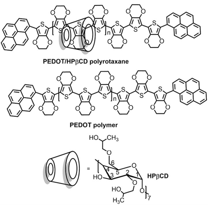 The oxidative polymerization of EDOT-HPβCD IC in water, using FeCl3 results in the formation of a pseudopolyrotaxane structure. Then, by blocking the end-chains of PEDOT with pyrene, the subsequent polyrotaxane is obtain.