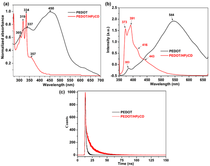 Fig. 8. Absorption spectra of PEDOT/HPβCD polyrotaxane and PEDOT (a), fluorescence (b), and lifetime spectra (c) in ACN.
