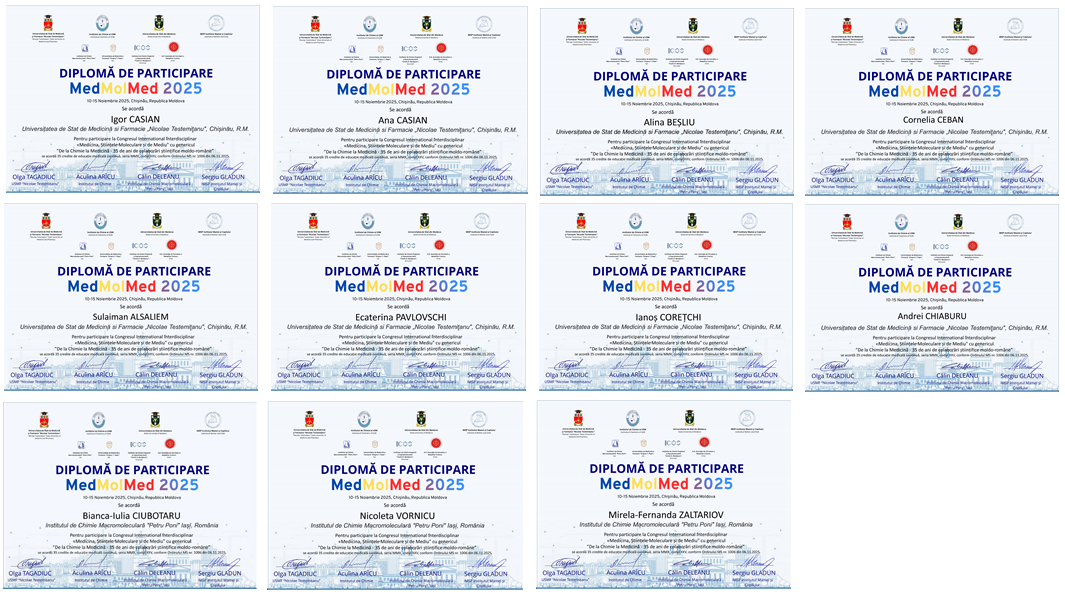 2. VORNICU, N., COREȚCHI, I., ZALTARIOV, M.-F., PEPTANARIU, D., CIUBOTARU, B.-I., GRECU, I., BEȘLIU, A., CHIABURU, A., BIBIRE, T. A new generation of antimicrobial agents based on multicomponent systems. În: Congresul Internațional „Medicine, Molecular and Environmental Sciences”, Chișinău, Republica Moldova, 10-15 noiembrie 2025. (Poster Presentation PP2.12), MedMolMed_2025_Program, p. 144. DOI: https://doi.org/10.19261/medmol25.